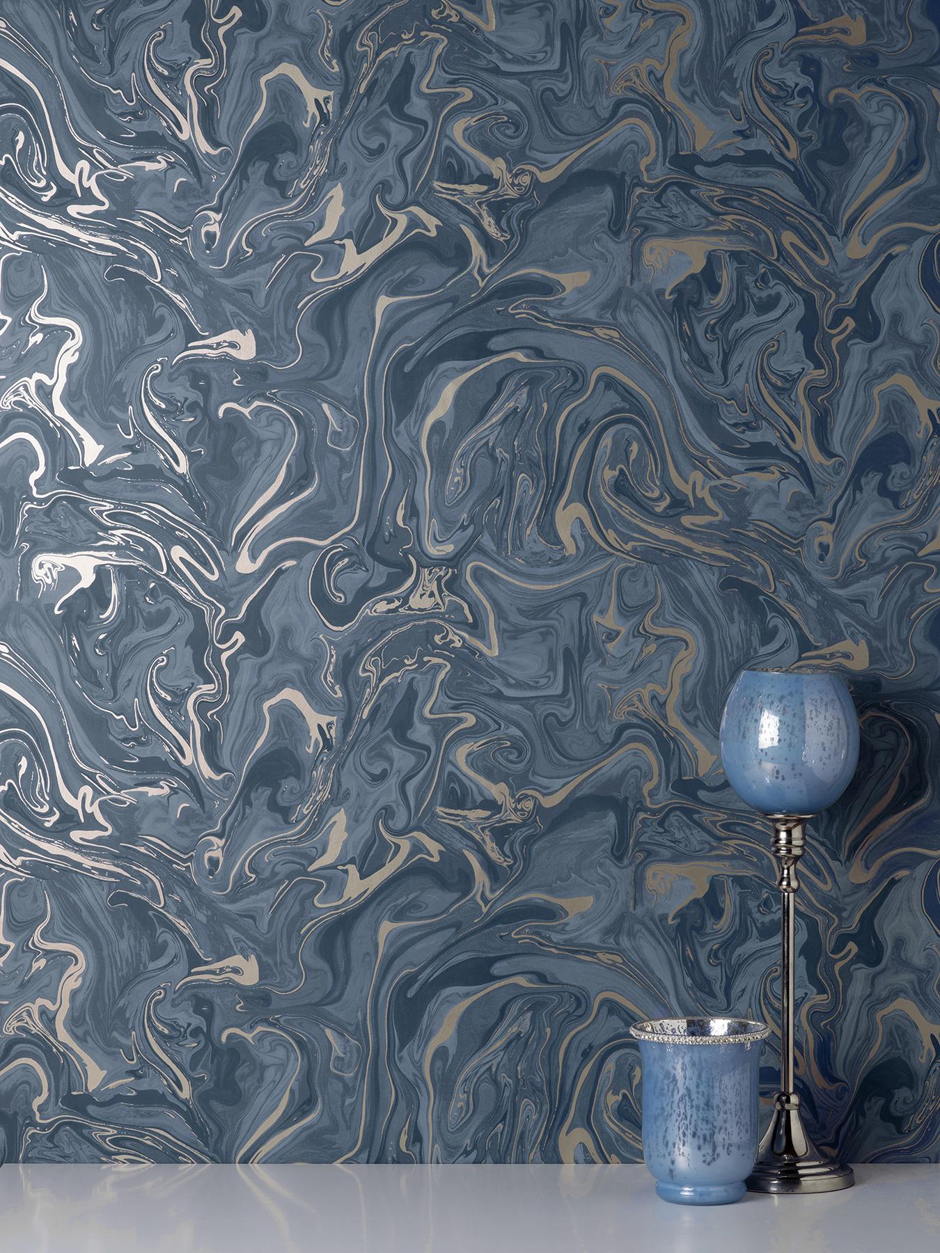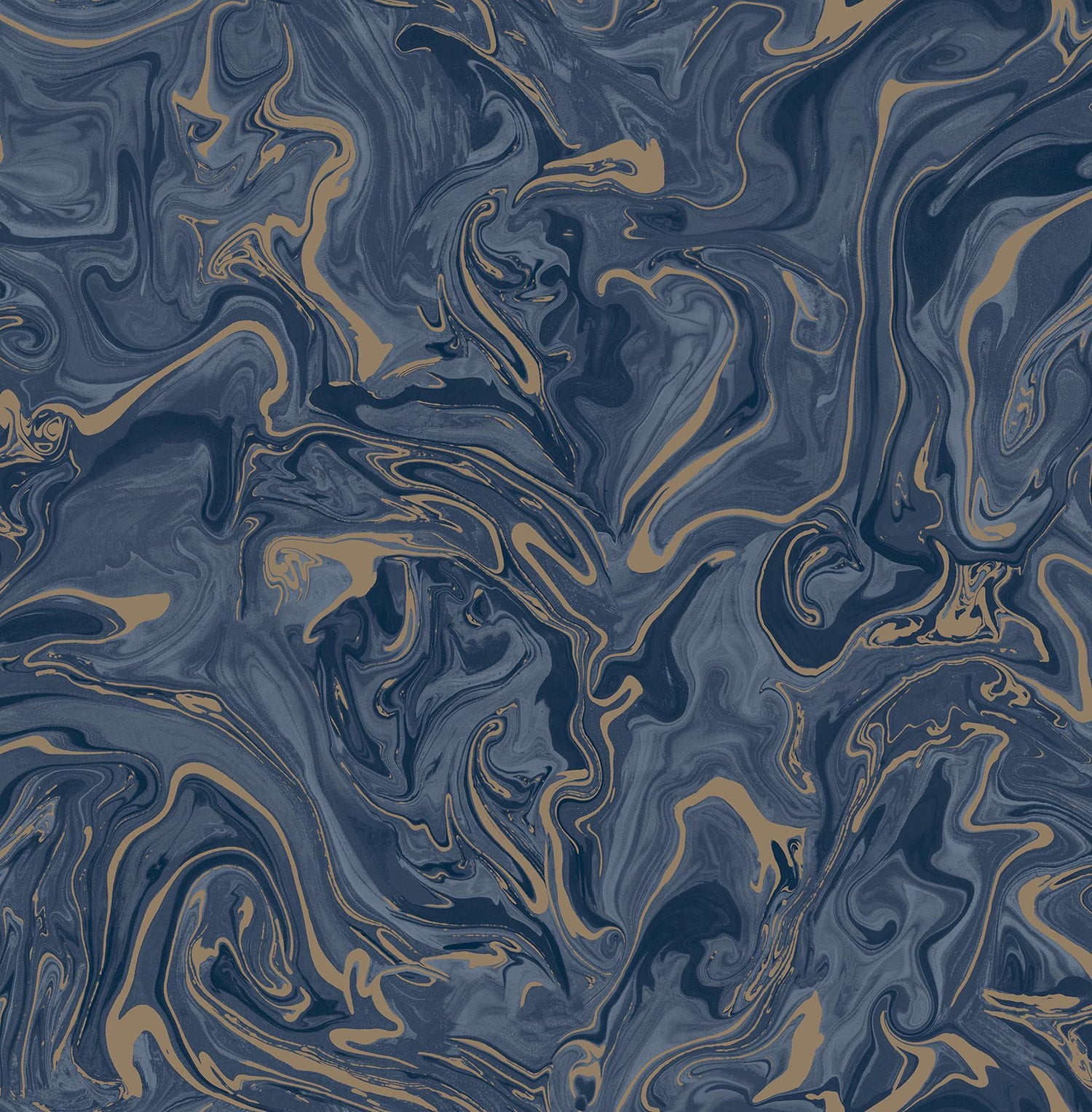 The classic sophistication of marbling is given a modern twist in this wallpaper. Shades of rich blue are swirled together, accented by touches of metallic gold. Suave is an unpasted, paper wallpaper.