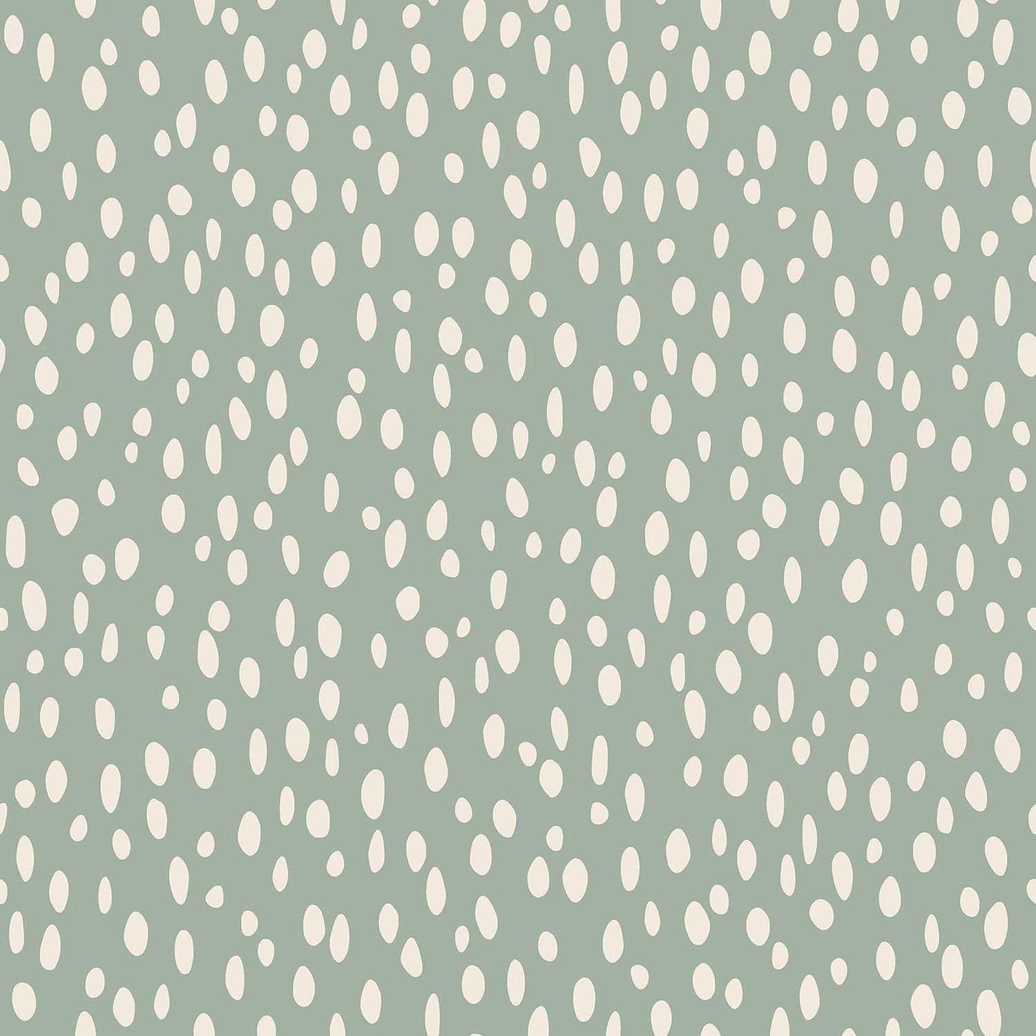 Add some whimsy to your space with this darling graphic pattern. White, oblong pebbles are sprinkled along a moss green backdrop. Willa is an unpasted, non woven wallpaper.