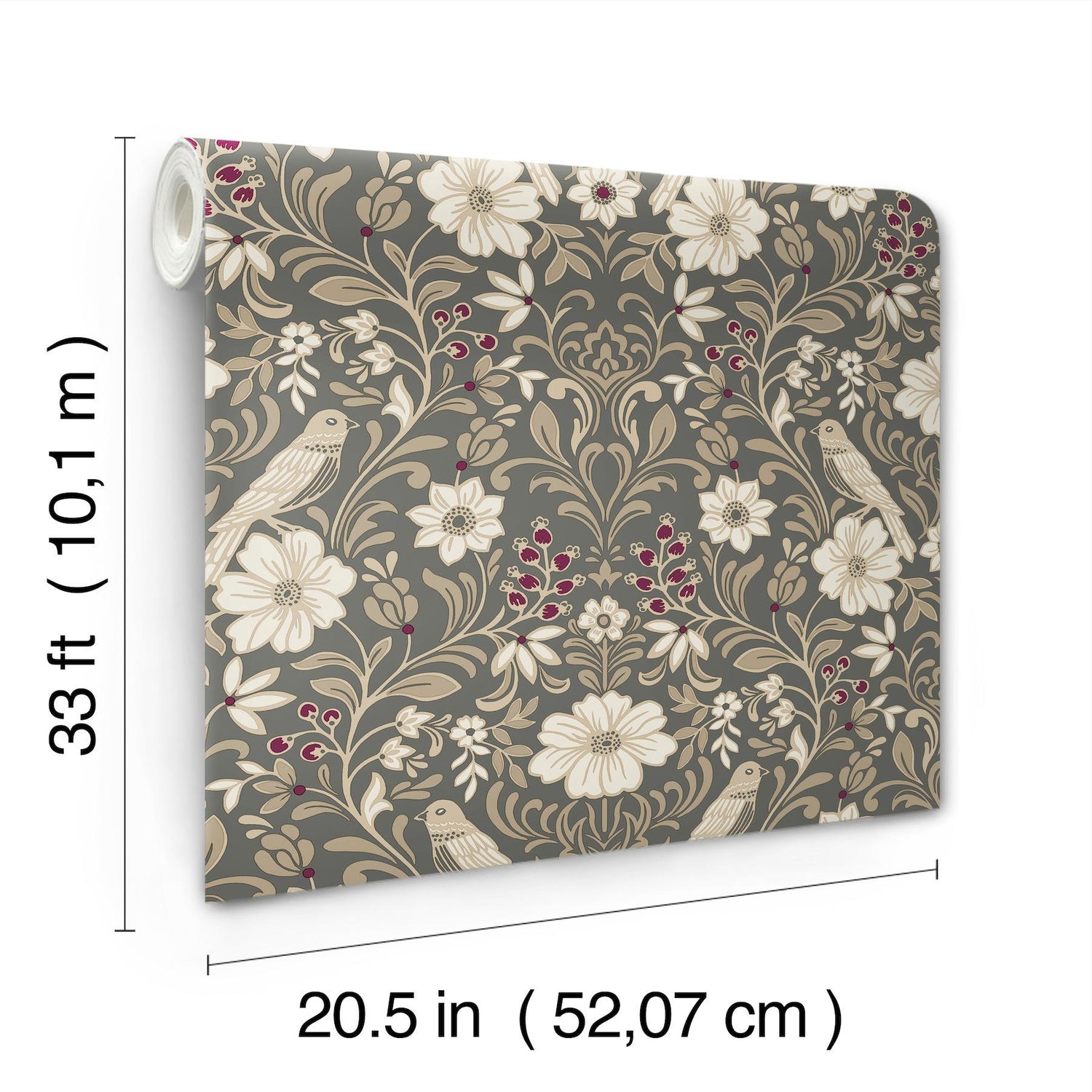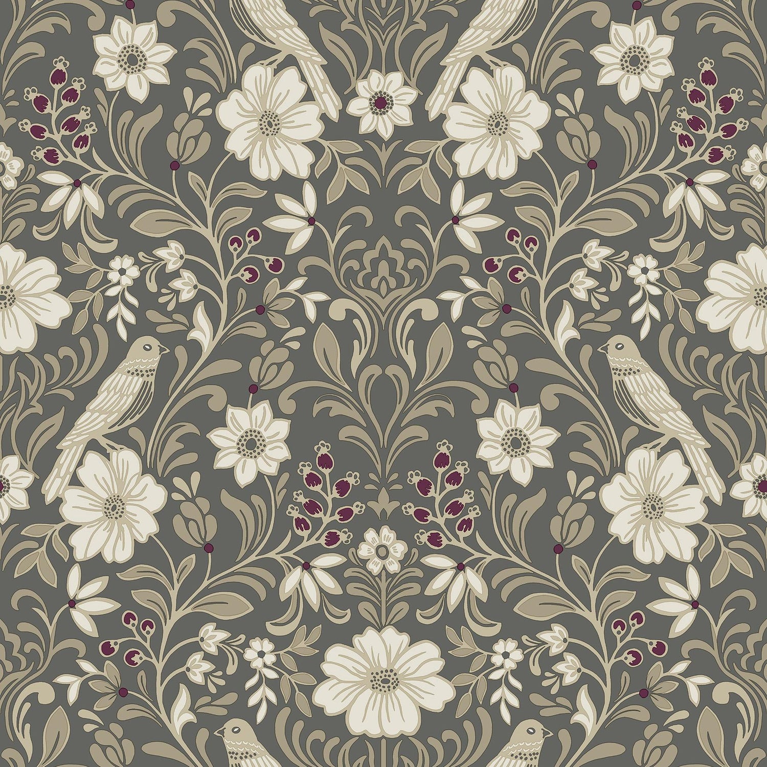 Sparrows perch on flourishing blooms amid rich vines and ripe berries in this delightful woodland damask wallpaper. Featuring white, taupe, beige, and mulberry detailing against a charcoal backdrop. This Colette Wallpaper measures approximately 20.5 inches wide by 33 feet long, measuring approximately 56.4 square feet per roll. This collection of timeless wallcoverings is layered with warmth and charm, and effortlessly blends nostalgic patterns with modern designs.This assortment has a little bit of everythingsimple stripes, subtle plaids, vintage motifs, and bold florals.