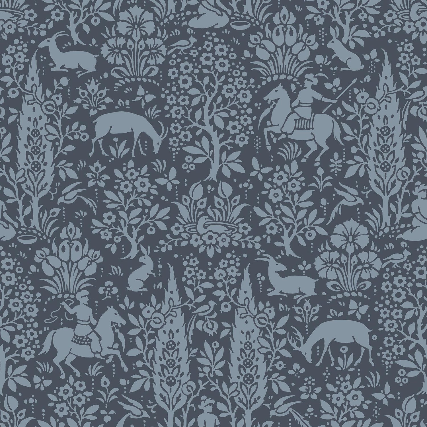 Shy deer, demure rabbits, and men on horseback mingle amongst delightful forest flowers in this eclectic wallpaper. Its rich blue hues give it a soothing effect, creating a pleasant and peaceful woodland design. Sherwood is an unpasted, paper wallpaper.