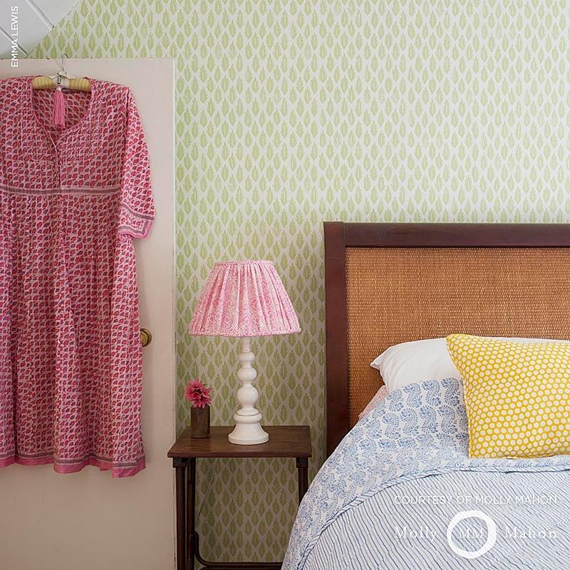 Drawing from the foliage outside her cottage in Sussex, artist Molly Mahon created this graphic, sweet wallcovering with all the perfectly-imperfect appeal of a hand block print.