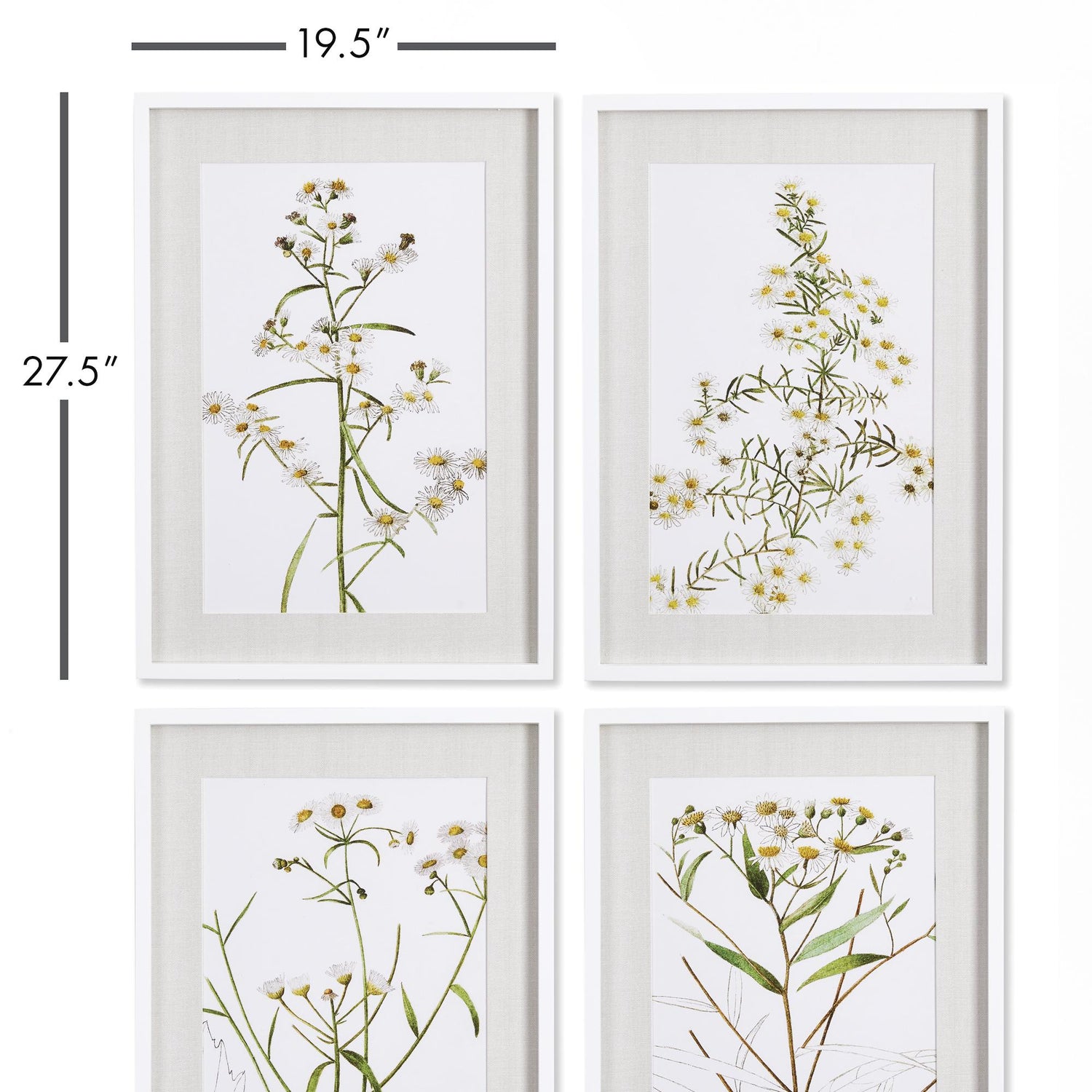 Each with their own distinct composition, this set of four Daisy Prints makes a sweet accent for your wall. The ivory linen-like mats and simple white frames make them neutral enough for any casual space.