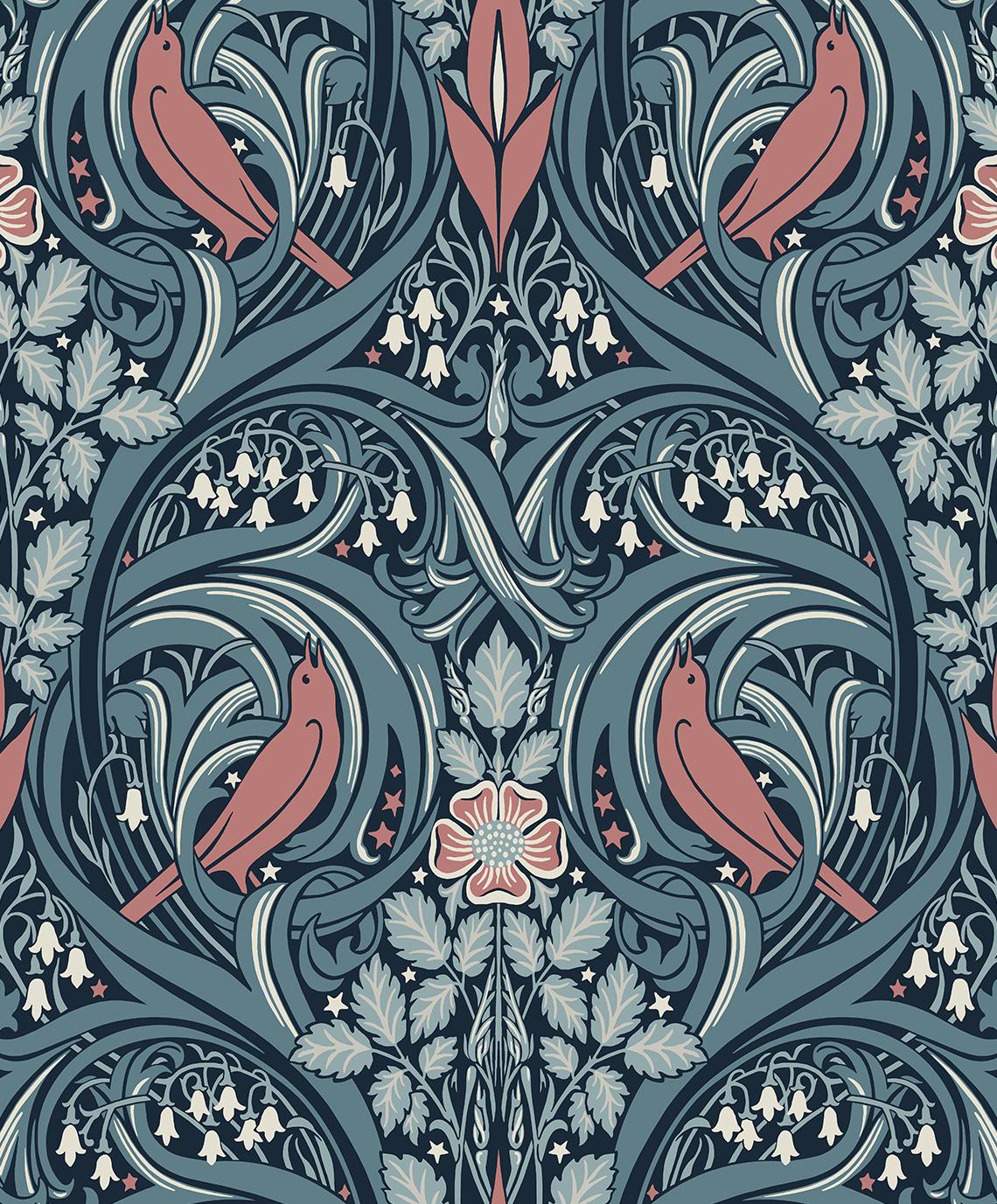 Seabrook Bird Scroll Aegean Teal & Coral Wallpaper