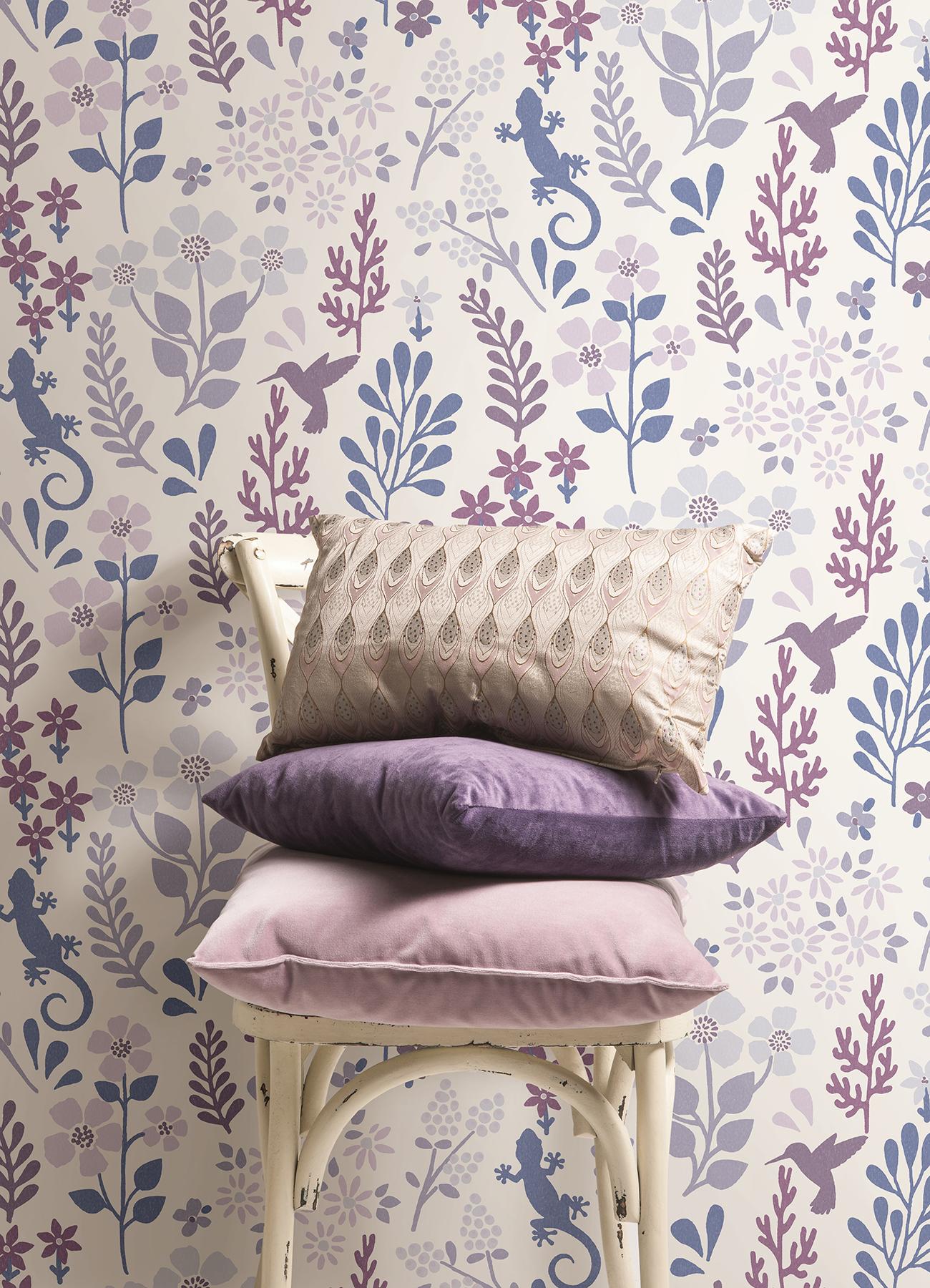 Featuring lizards, hummingbirds, floral accents and fronds in a variety of blue and purple hues, this peel and stick wallpaper is a darling option for interiors. The cool color palette and little critters in this design would make for the perfect feature wall in a nursery, powder room, and so much more! Periwinkle Zoey Leaf Peel and Stick Wallpaper comes on one roll that measures 20.5 inches wide by 18 feet long.