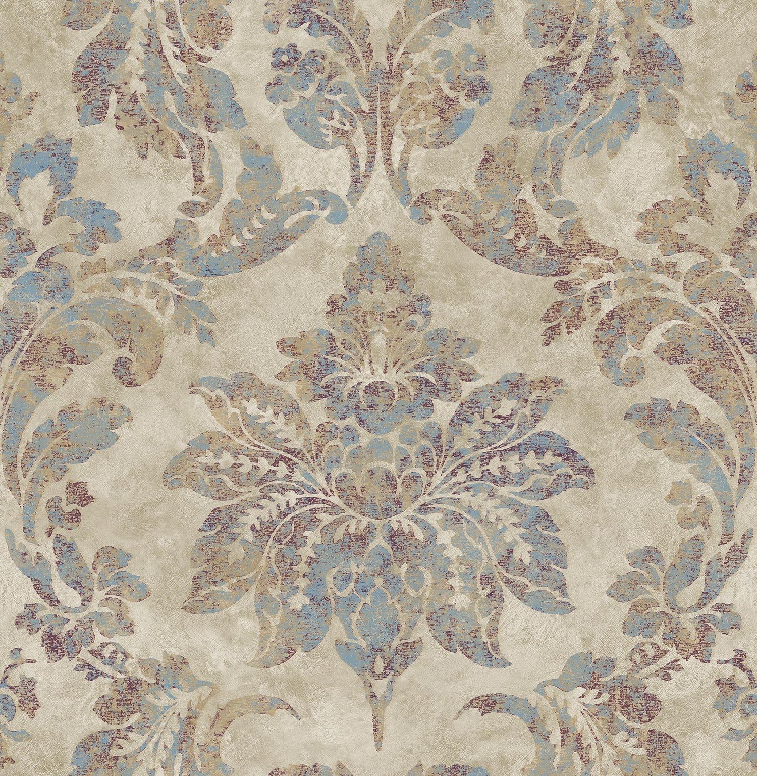 A beautiful and classic damask wallpaper. The textured beige background reflects the distressed burgundy pattern, which has gold and blue accents. Astor is a non woven, unpasted wallpaper.