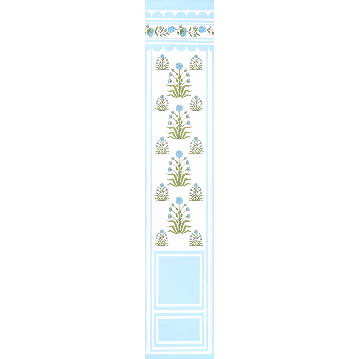 A charming combination of stylized flowers, scalloped borders and architectural geometries, Royal Poppy Panel B in blue is a 27"-wide wallpaper panel that can be used with or without its 54"-wide companion, Royal Poppy Panel A. Inspired by her work as a decorative painter in Jaipur, India, Marie-Anne Oudejans designed this flexible two-panel wallpaper set so that it can be configured to accentuate the architecture of a space or create depth and drama when walls need visual interest.