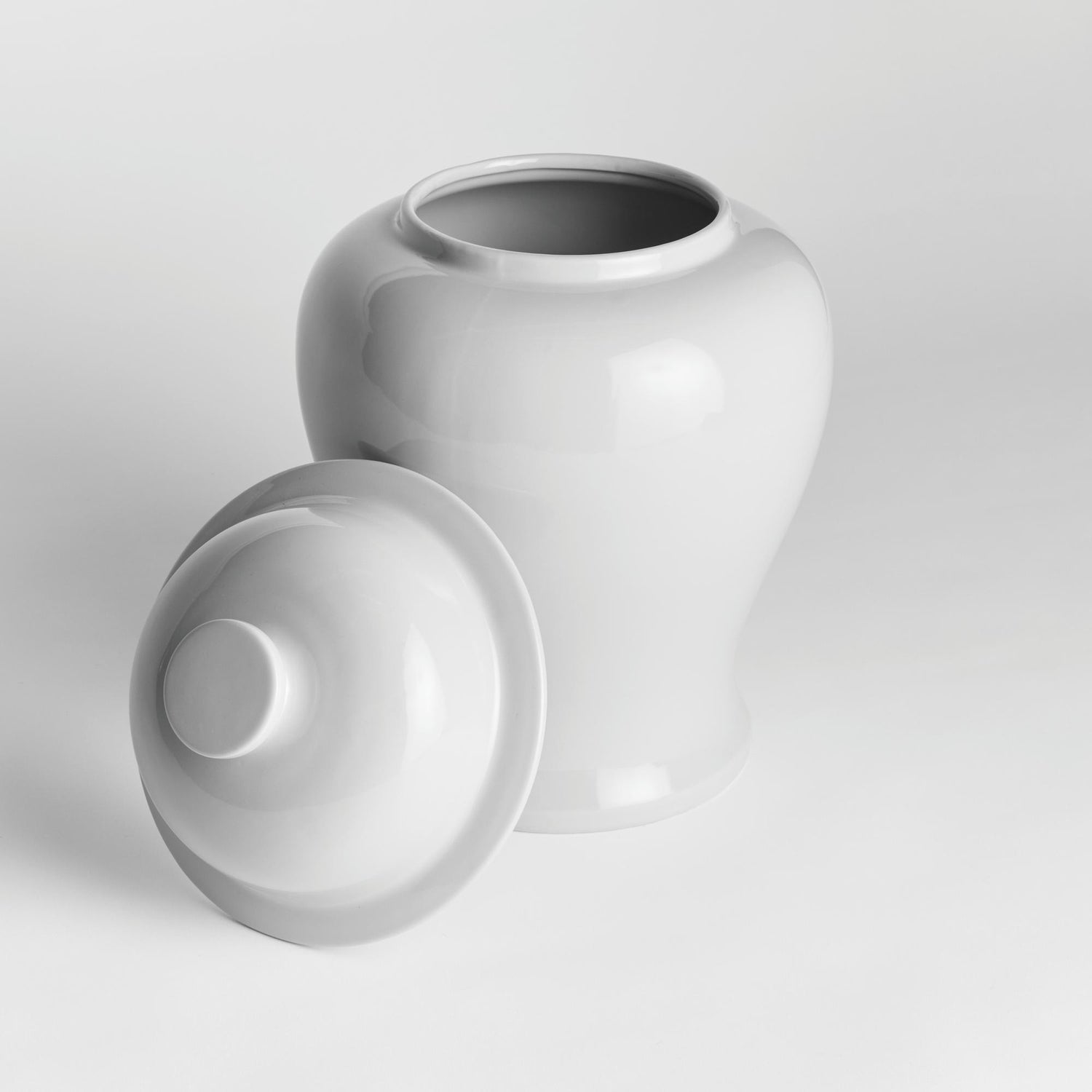 In an unexpected smaller size for traditional ginger jars, this is a modern take on a classic. The bright white high gloss glaze creates a more high end feel. Mix in among your patterned pieces in bookshelf or on a credenza for a dynamic look.