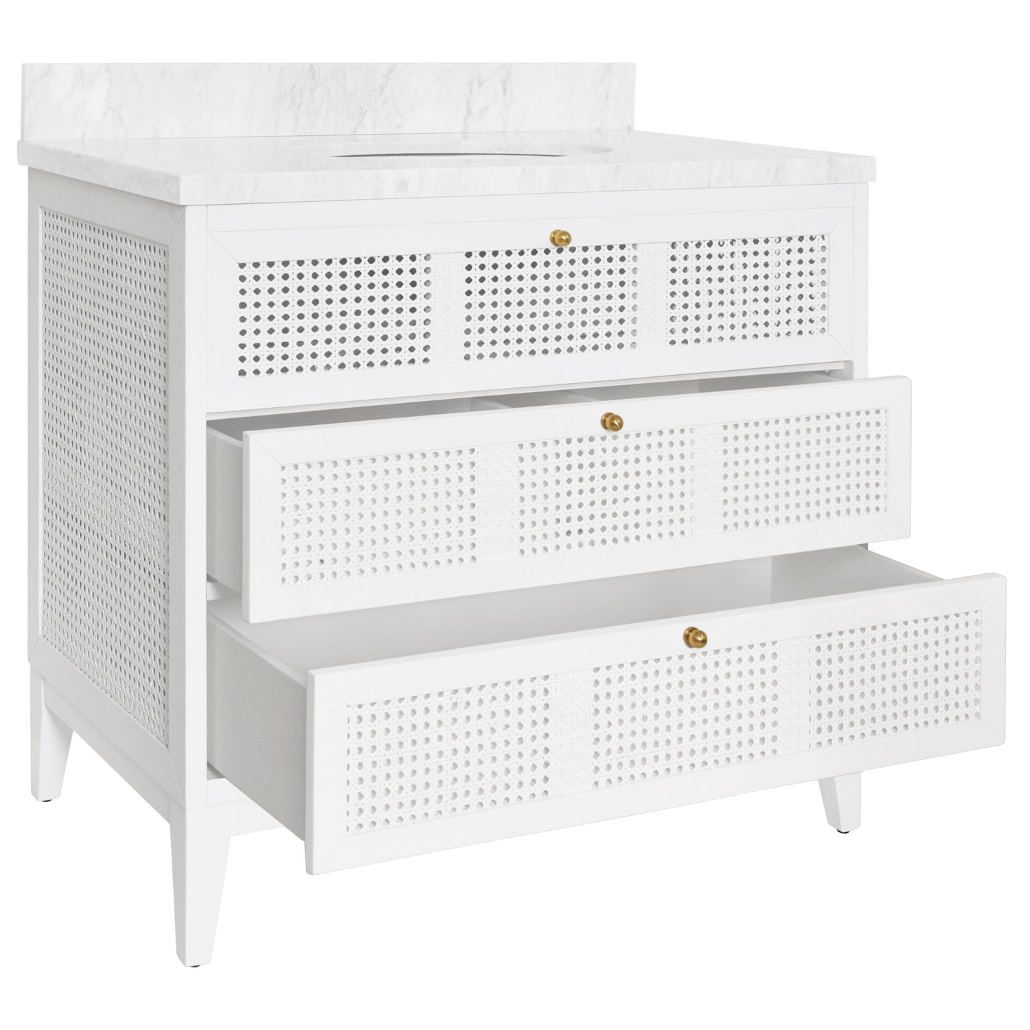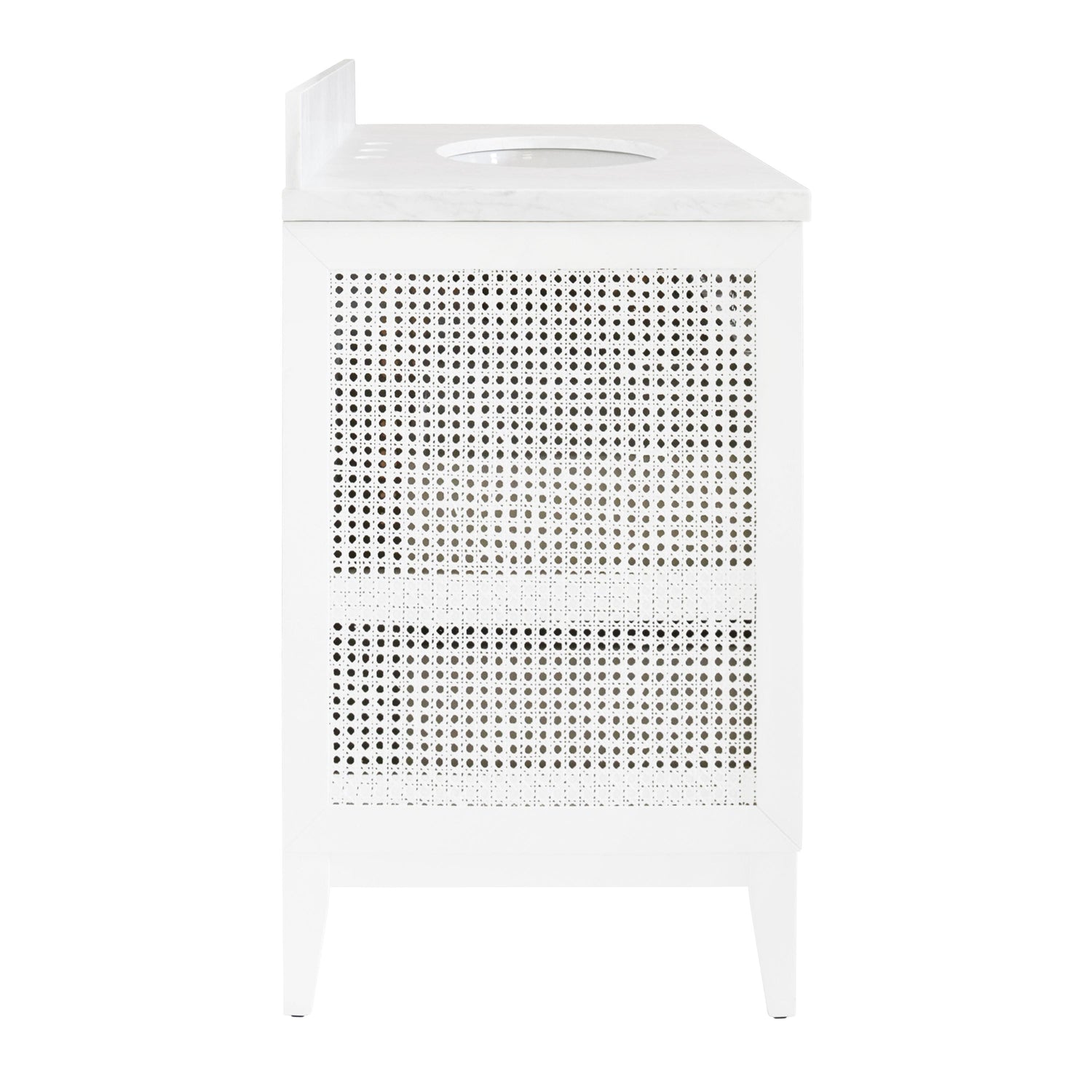 International For Worlds Away Bath Vanity In Matte White Lacquer With Cane Front Drawers, White Marble Top, And Porcelain Sink (Worlds Away)