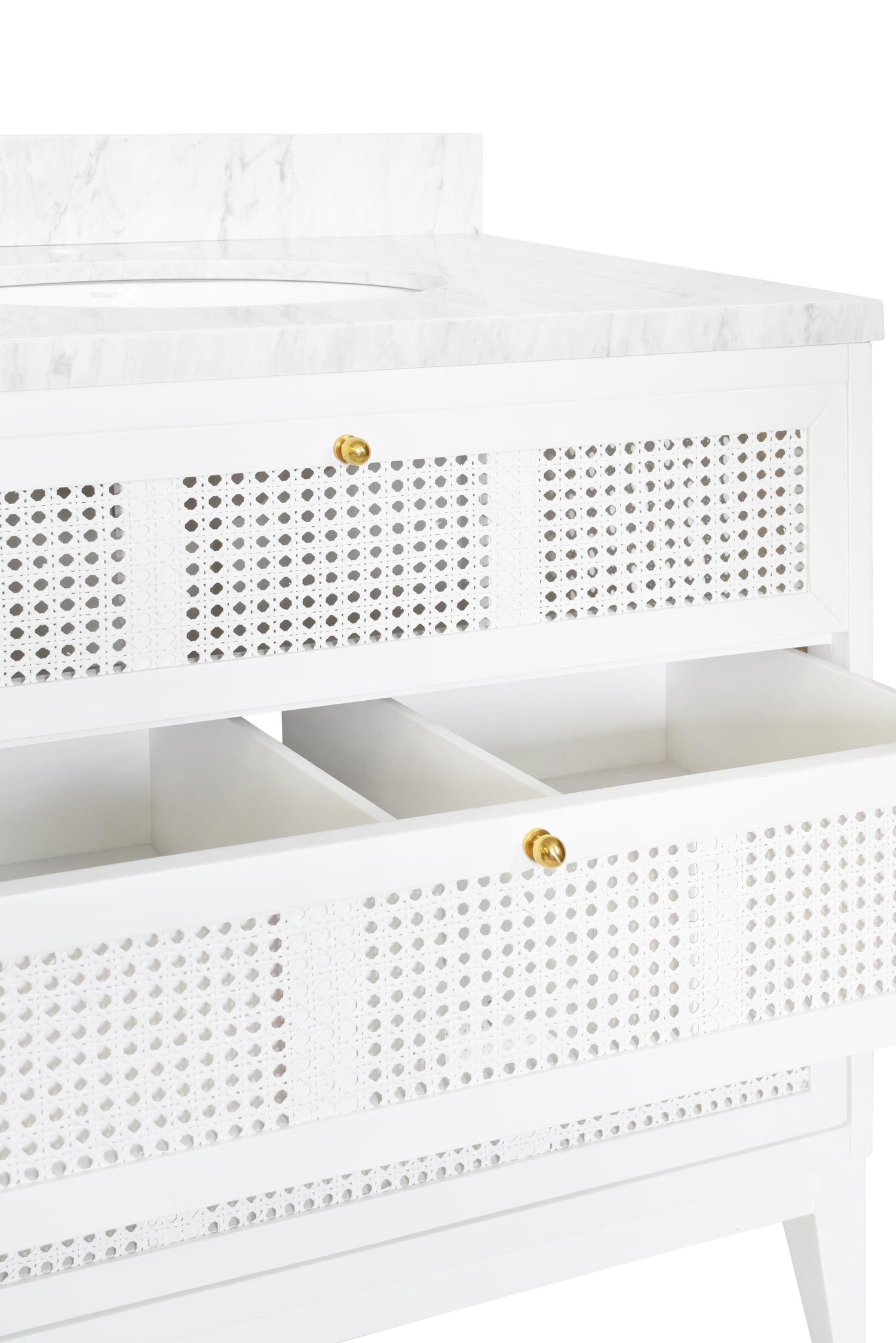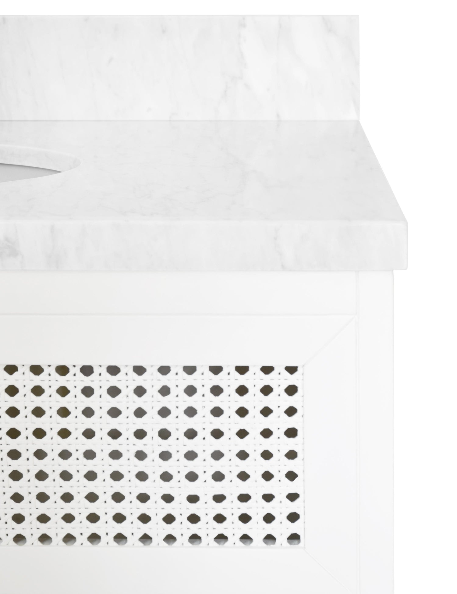Returns For Worlds Away Bath Vanity In Matte White Lacquer With Cane Front Drawers, White Marble Top, And Porcelain Sink (Worlds Away)