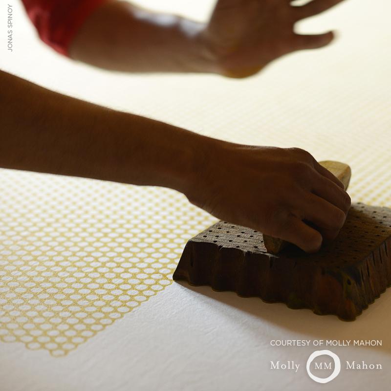 A CHARMING SMALL-SCALE PATTERN INSPIRED BY THE DECORATIONS ON INDIAS BELOVED TUK TUKS. HAND-BLOCK PRINTED IN INDIA BY MASTER CRAFTSMEN