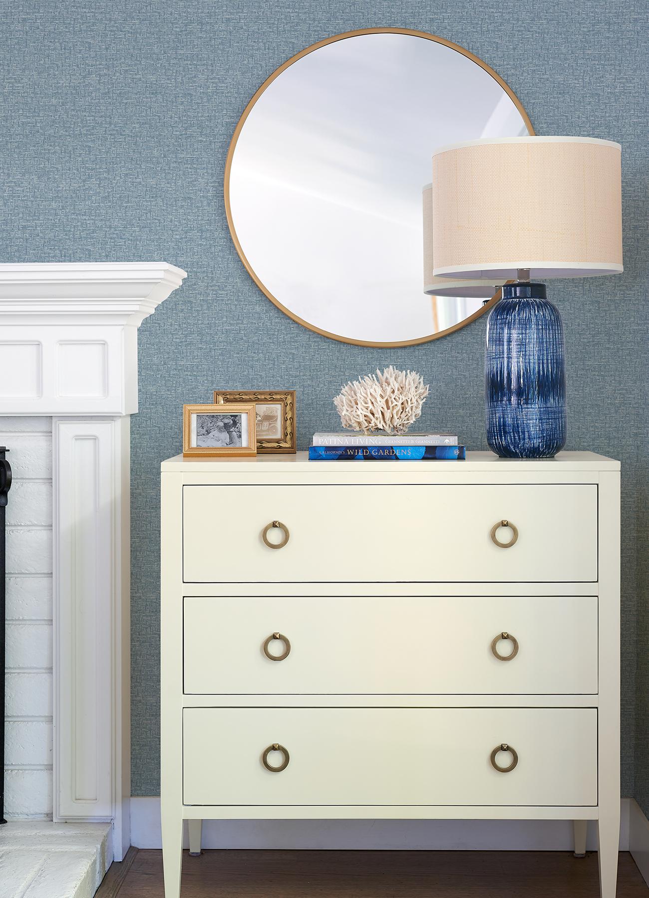 Bring a dose of rich color and dimensional detailing to your walls with this textured design. Dark blue raised inks form a basketweave pattern along a blue faux grasscloth backdrop. Minerva is an unpasted, non woven wallpaper.