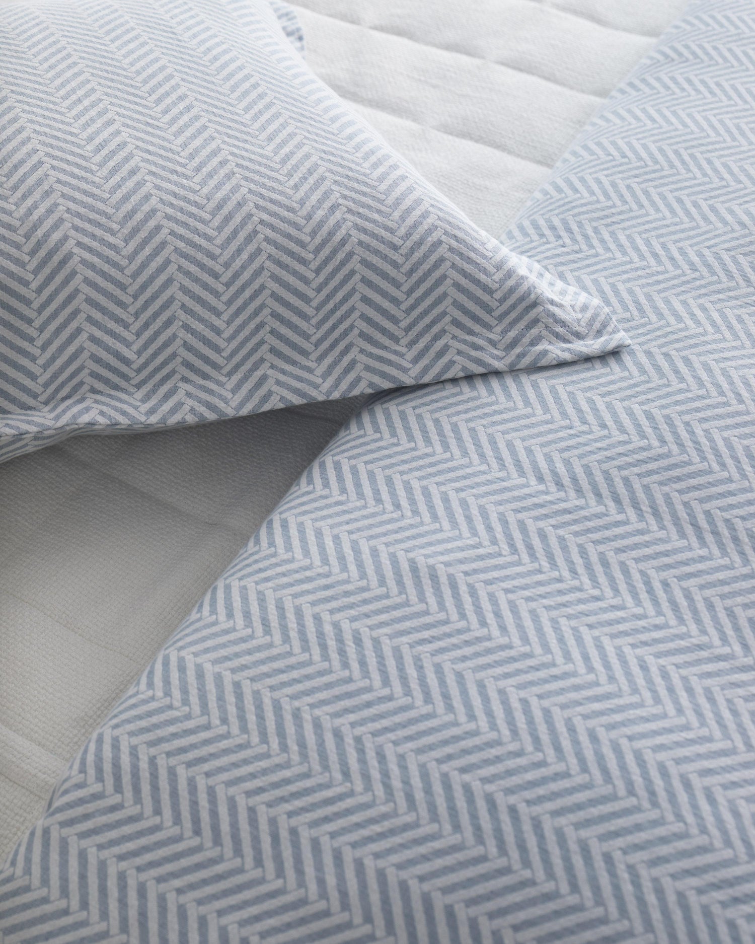 Named Aran for the Irish knit, this 100% cotton duvet set features a blue and white herringbone weave. Oeko-Tex certified.