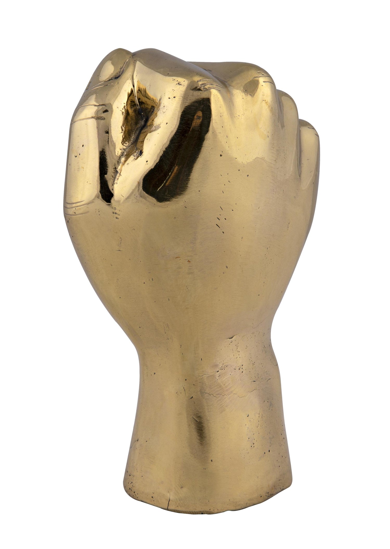 A closed fist, raised proudly, is rendered simply in an expertly weathered warm antique finish. Featuring raw, stylized lines, this intriguing brass sculpture is the perfect piece to add interest to any modern decor. Handcrafted of brass, no two will be identical.