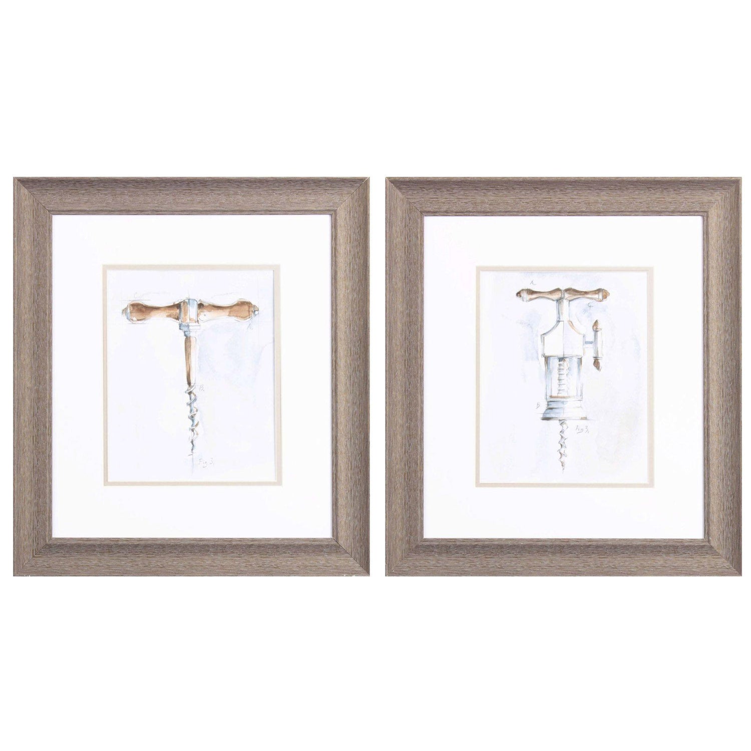 A set of two watercolor patent prints that are double matted and framed under glass with a wood tone frame.