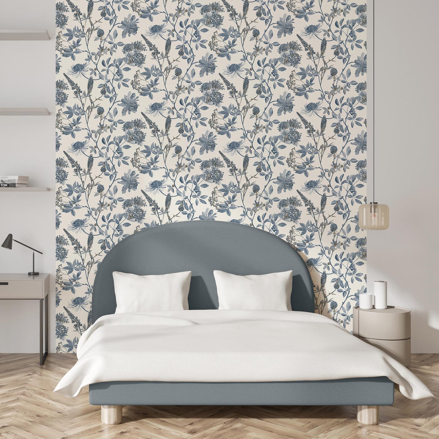 International For Veer Decor Botanical Print Blue With Ecru Cream Ground Wallpaper (Veer Decor)