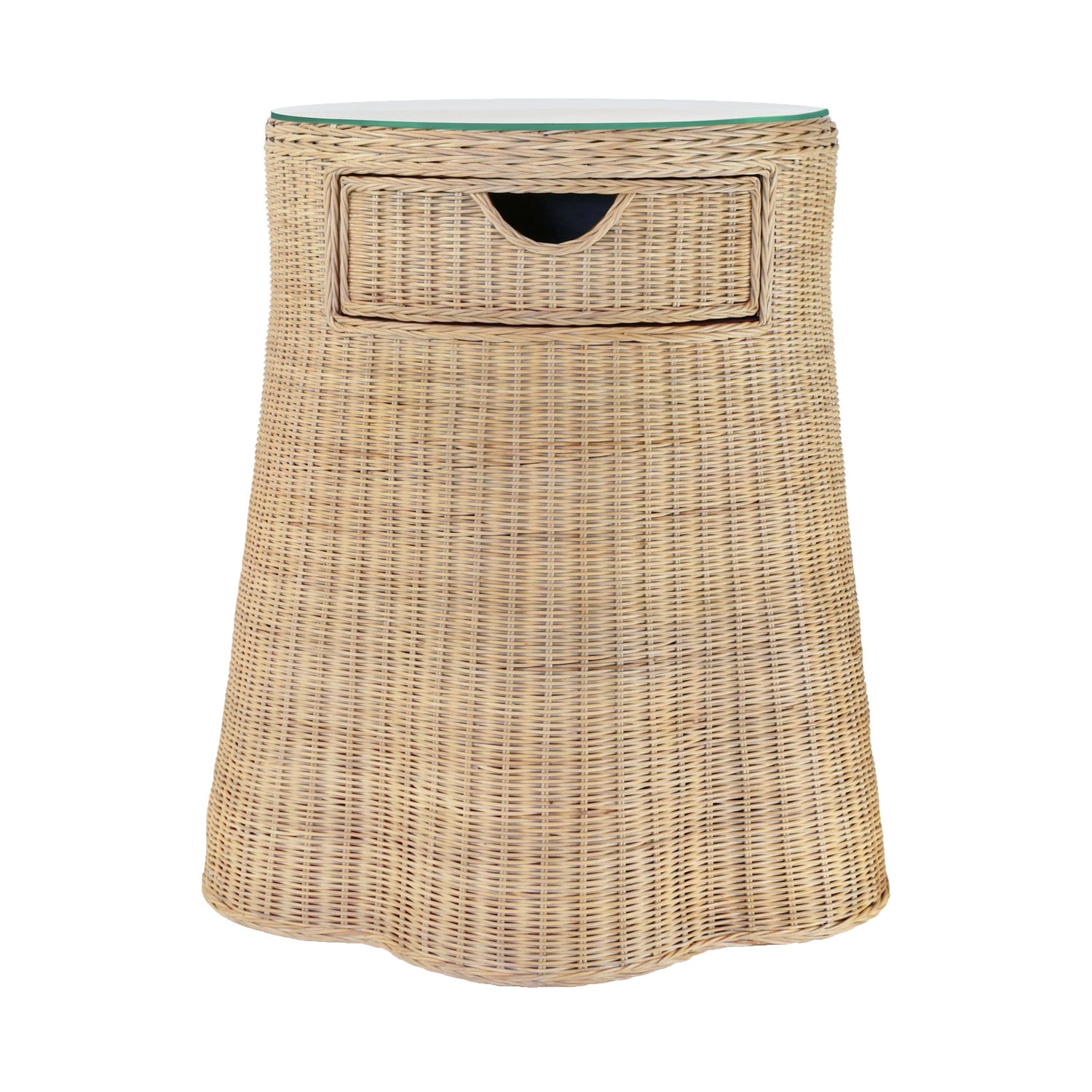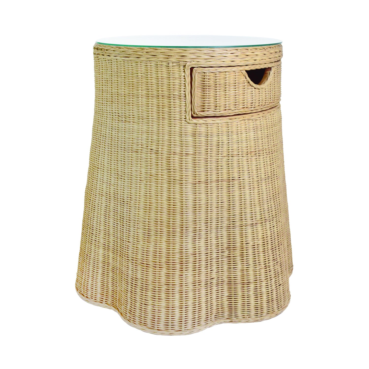 International For Worlds Away One Drawer Round Side Table With Flared Scalloped Base In Rattan With Glass Top (Worlds Away)