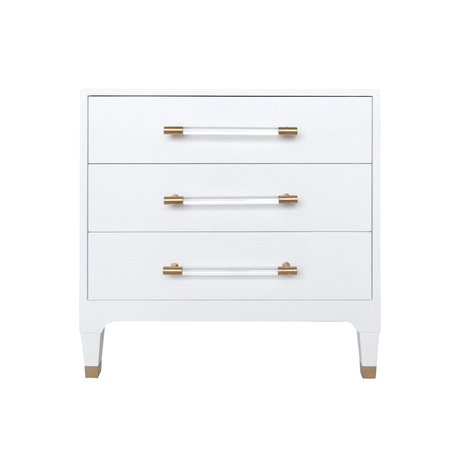International For Worlds Away Three Drawer Side Table In Textured White Linen With Antique Brass And Acrylic Hardware (Worlds Away)